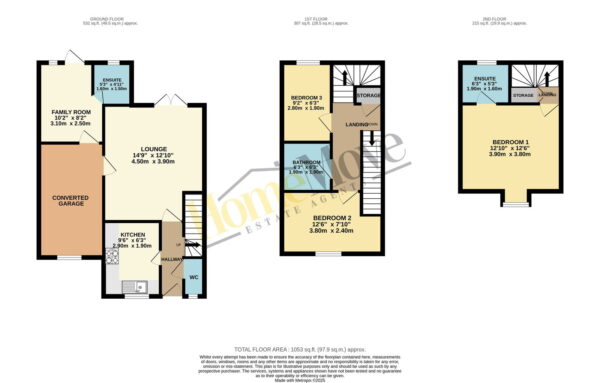 On the first floor, there are two bedrooms, as well as the family bathroom, which comprises a panel bath, a wash hand basin, and a low-level flush WC. The second floor features the master bedroom and an en-suite shower room.