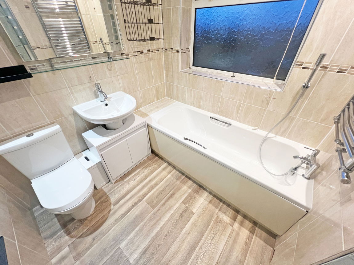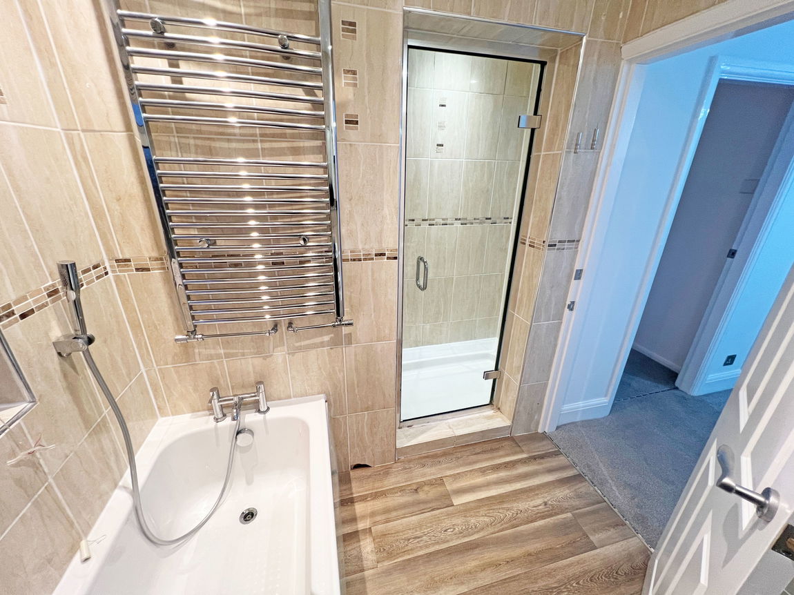 The first-floor landing provides access to all three bedrooms and a family bathroom, which comprises a panel bath, a low-level flush WC, a wash hand basin, and a separate shower.