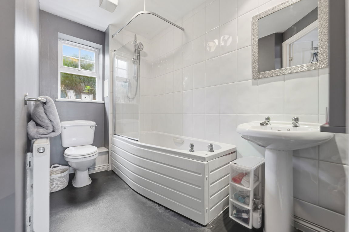 The bathroom showcases a stylish 3-piece suite, complete with a bath (including an overhead shower), wash hand basin, and WC. It’s well-appointed with double-glazed windows, a central heating radiator, and an extractor fan for added convenience.