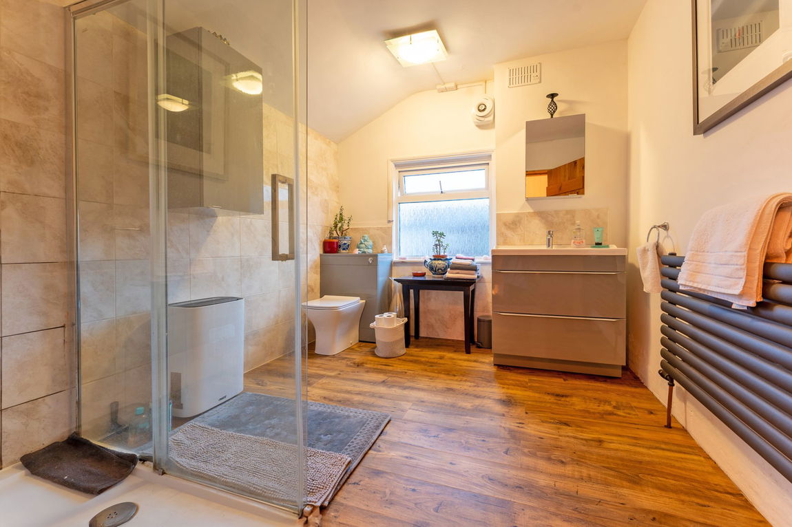 To the first floor, there is a large refitted shower room comprising of a double shower enclosure, wash basin unit and WC. Bedroom two is a generous double room with views over the rear garden, while the main bedroom is an excellent size and benefits from built-in storage and tasteful décor throughout.