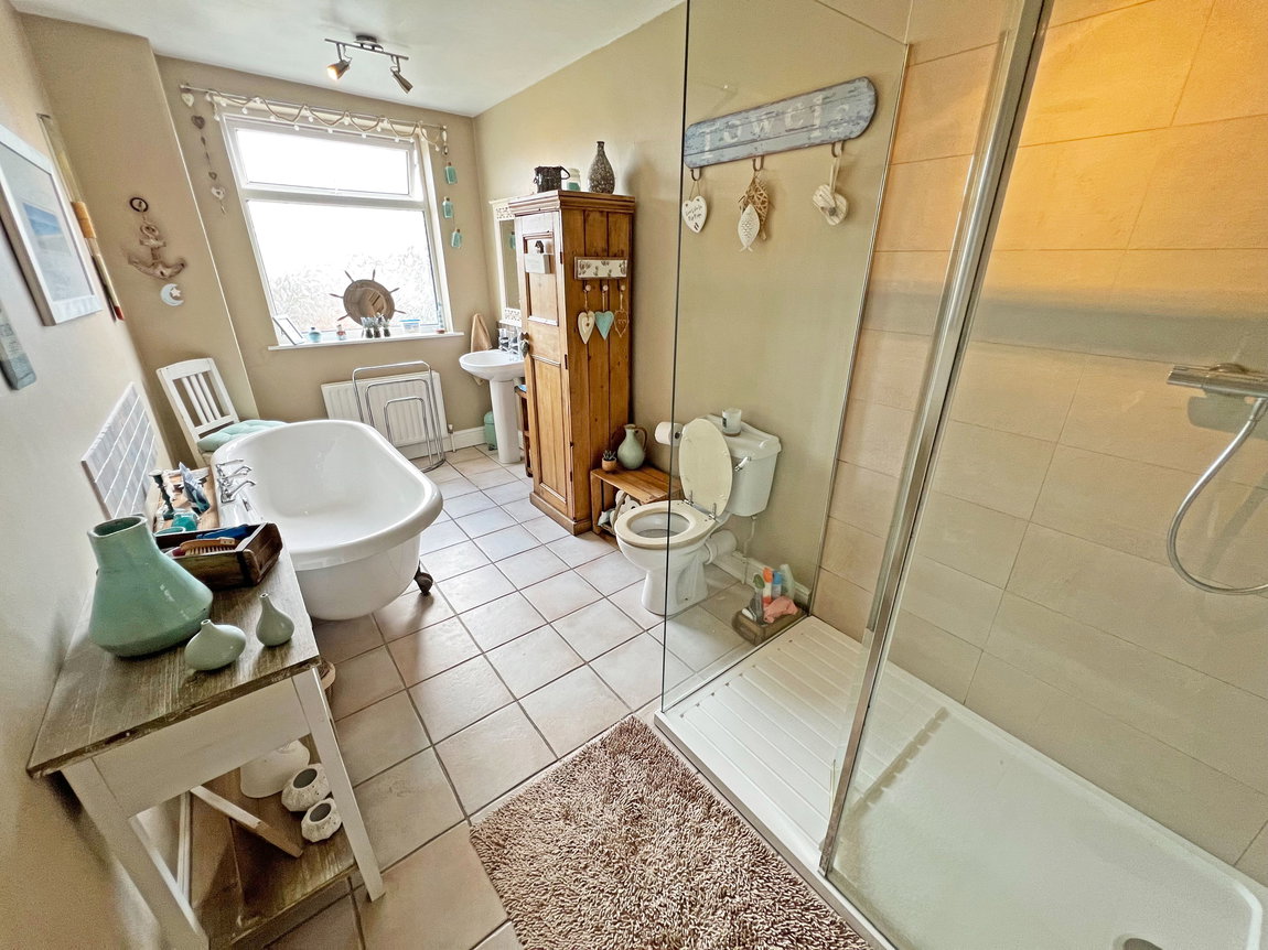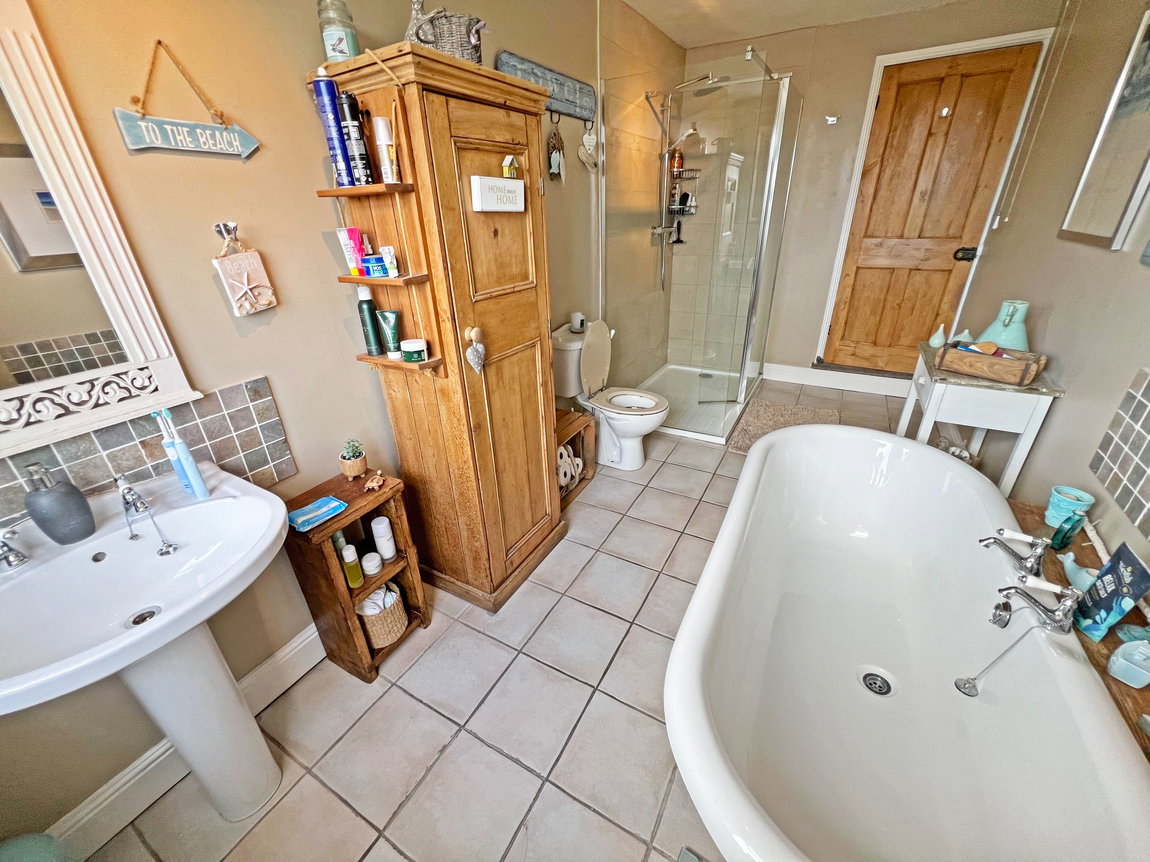 The first-floor landing provides access to two bedrooms and a family bathroom, which features a standalone rolled top bath, a walk-in shower, a low-level flush WC, and a wash hand basin.